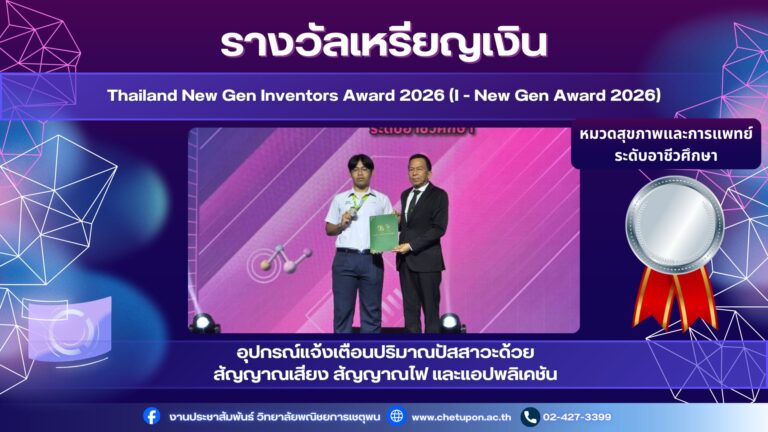 ขอแสดงความยินดีวิทยาลัยพณิชยการเชตุพนขอแสดงความยินดีกับผลงาน อุปกรณ์แจ้งเตือนปริมาณปัสสาวะด้วยสัญญาณเสียง สัญญาญไฟ และแอปพลิเคชันซึ่งได้รับรางวัลอันทรงเกียรติจากเวทีประกวด “Thailand New Gen Inventors Award 2026” (I – New Gen Award 2026)คว้ารางวัลเหรียญเงิน หมวดสุขภาพและการแพทย์ความสำเร็จในครั้งนี้สะท้อนถึงศักยภาพด้านนวัตกรรมและความคิดสร้างสรรค์ของนักเรียน นักศึกษาอาชีวศึกษาที่สามารถพัฒนาได้อย่างมีคุณภาพและสร้างชื่อเสียงให้กับวิทยาลัยในระดับนานาชาติ ผู้พัฒนาผลงาน :นายพัทธดนย์ นือขุนทดนายพชร แสนอุดมโชคนายวรณัฐ ปรางค์บุรีนางสาววรรณมณี ทองดีนายนพรัตน์ วงวิลาศสาขาวิชาเทคโนโลยีธุรกิจดิจิทัล ครูที่ปรึกษา :นางสาวชาริกา ศิลปวิชัยนางอาทิตา บุญประสิทธิ์นางสาววรินดา อนุอัน