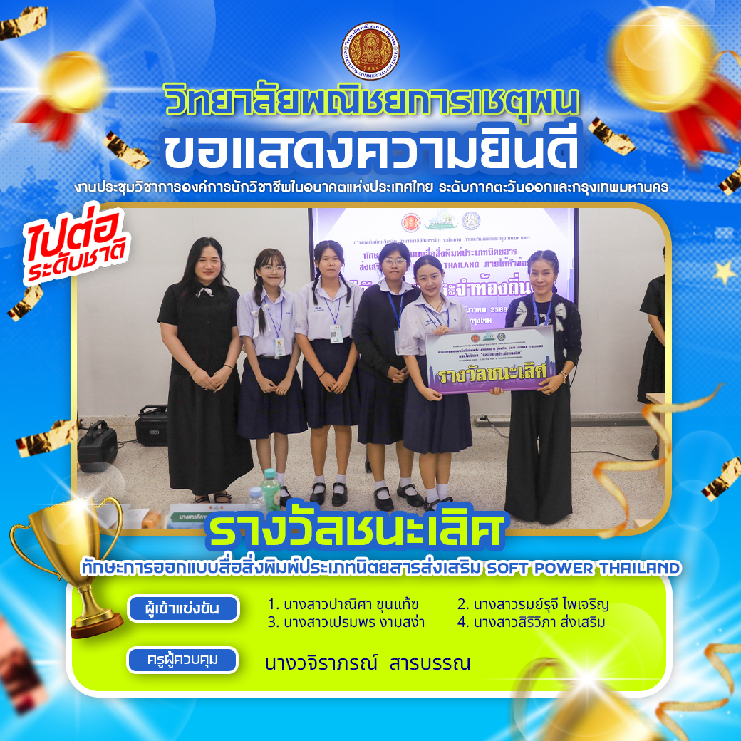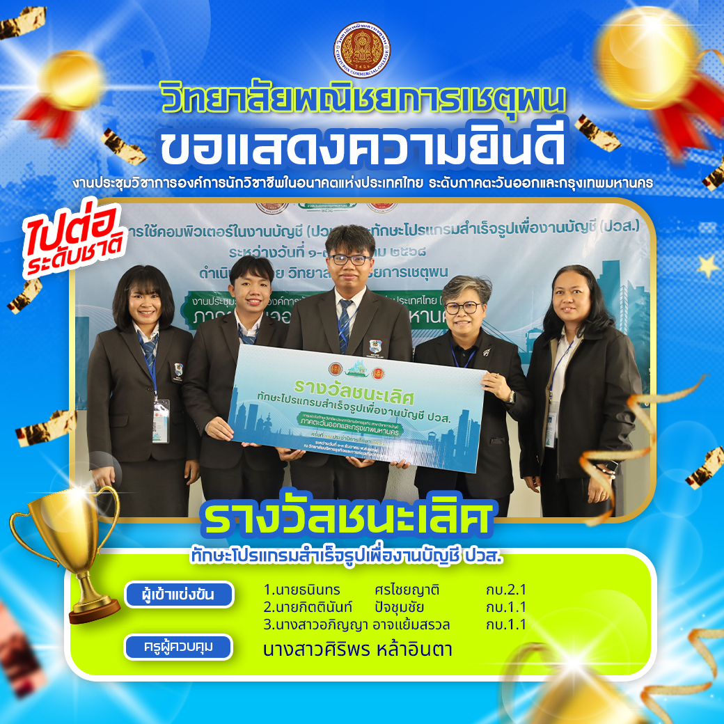 รางวัลชนะเลิศการแข่งขันทักษะทักษะโปรแกรมสำเร็จรูปเพื่องานบัญชี ปวส.ในงานประชุมวิชาการองค์การนักวิชาชีพในอนาคตแห่งประเทศไทย ระดับภาคตะวันออกและกรุงเทพมหานคร