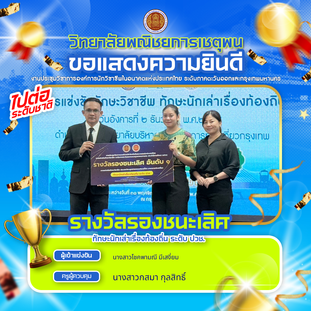 รางวัลรองชนะเลิศ การแข่งขันทักษะนักเล่าเรื่องท้องถิ่น ระดับ ปวช. ประเภท