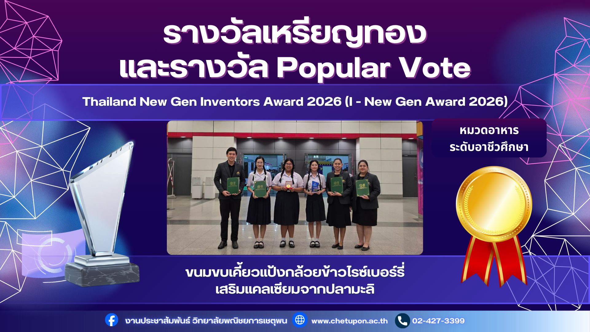 วิทยาลัยพณิชยการเชตุพนขอแสดงความยินดีกับผลงาน ขนมขบเคี้ยวแป้งกล้วยข้าวไรซ์เบอร์รี่เสริมแคลเซียม จากปลามะลิได้รับรางวัลอันทรงเกียรติจากเวทีประกวด I New